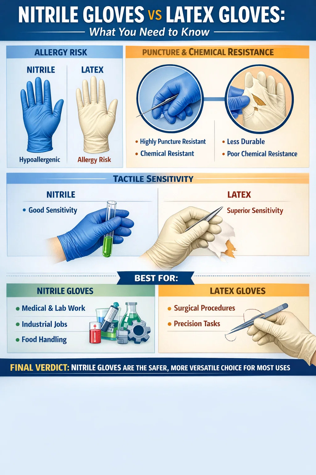 ومع ذلك، فإن كلمة "أكثر أمانًا" تعتمد على السياق المحدد الخاص بك. لا تزال قفازات اللاتكس تتمتع بمزايا ذات معنى في حساسية اللمس والمرونة، مما يجعلها مفضلة في بعض الإعدادات الجراحية والإجرائية الدقيقة. الهدف من هذه المقالة هو تفصيل الاختلافات بوضوح حتى تتمكن من اتخاذ قرار مستنير بناءً على حالة الاستخدام الفعلية الخاصة بك - وليس توصية بمقاس واحد يناسب الجميع.