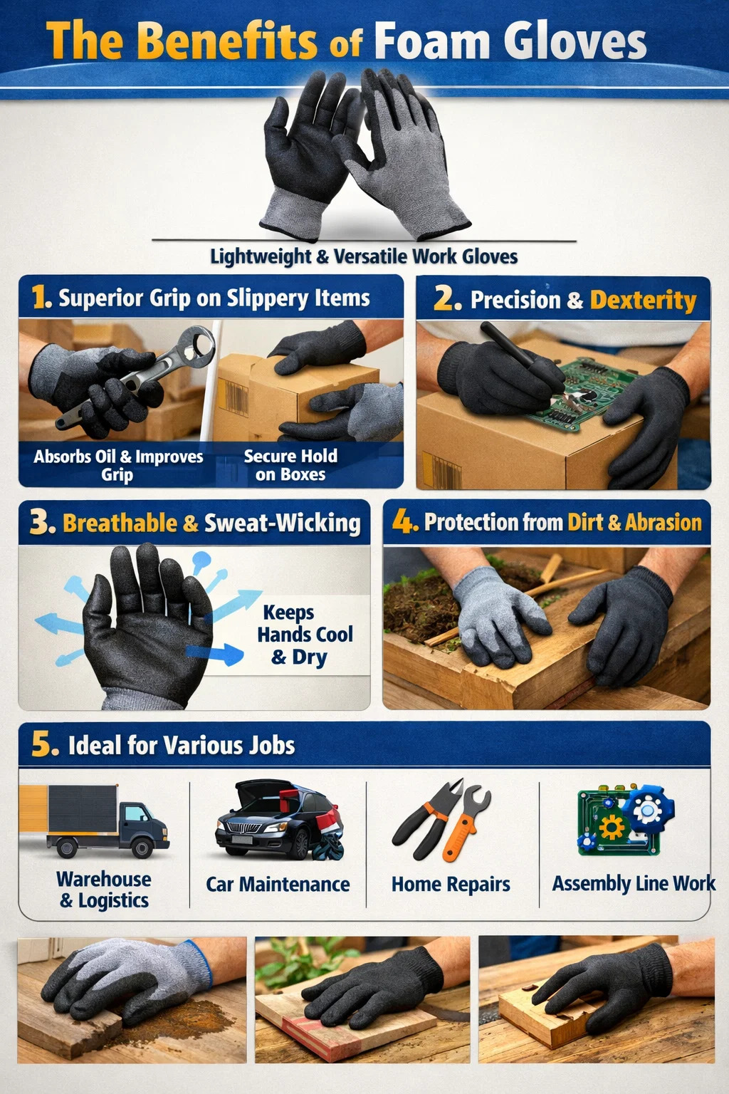 امتصاص الزيت ومقاومة الانزلاق: عند إصلاح السيارات أو التعامل مع الآلات، غالبًا ما تصبح يديك دهنية. تصبح القفازات البلاستيكية العادية غير قابلة للاستخدام عندما تكون زيتية، لكن طلاء القفازات الرغوية يعمل مثل الإسفنجة، مع وجود العديد من المسام الصغيرة التي تمتص بعضًا من الزيت السطحي والماء، مما يسمح لك بالإمساك بالأجزاء والمفاتيح بثبات.