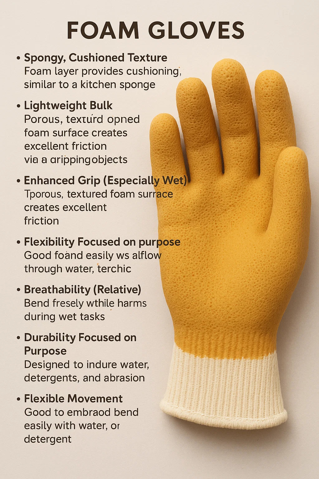 تتميز معظم القفازات الرغوية المخصصة للتنظيف ببطانة من القماش (القطن والبوليستر) لتوفير الراحة على الجلد، مغموسة في رغوة اللاتكس أو PVC.