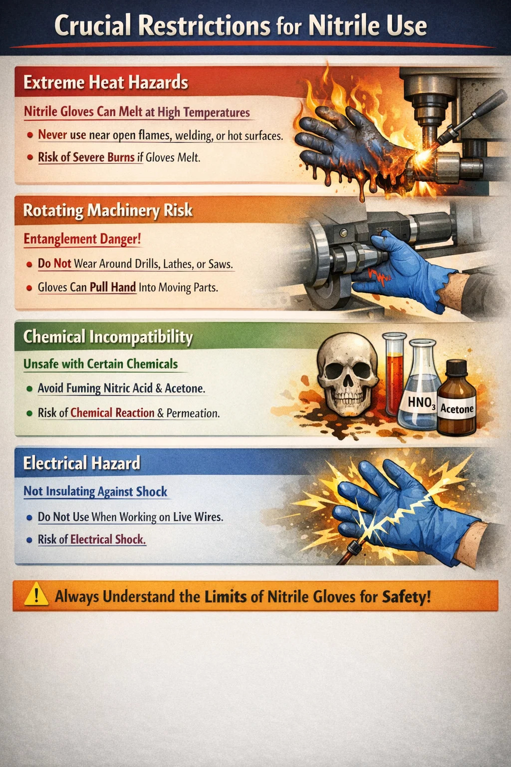 يجب عدم استخدام النتريل عند التعامل حامض النيتريك المدخن أو حامض الكبريتيك المركز . هذه المواد الكيميائية عبارة عن مؤكسدات قوية يمكن أن تتفاعل طاردة للحرارة مع المطاط الصناعي، مما قد يؤدي إلى نشوب حريق في يديك. علاوة على ذلك، فإن المذيبات تحب الأسيتون (الكيتونات) أو MEK سوف تتخلل القياسية قفازات النتريل في ثوانٍ، مما يتسبب في تورم القفاز وتحلله، مما يسمح للسموم بالوصول إلى بشرتك على الفور.